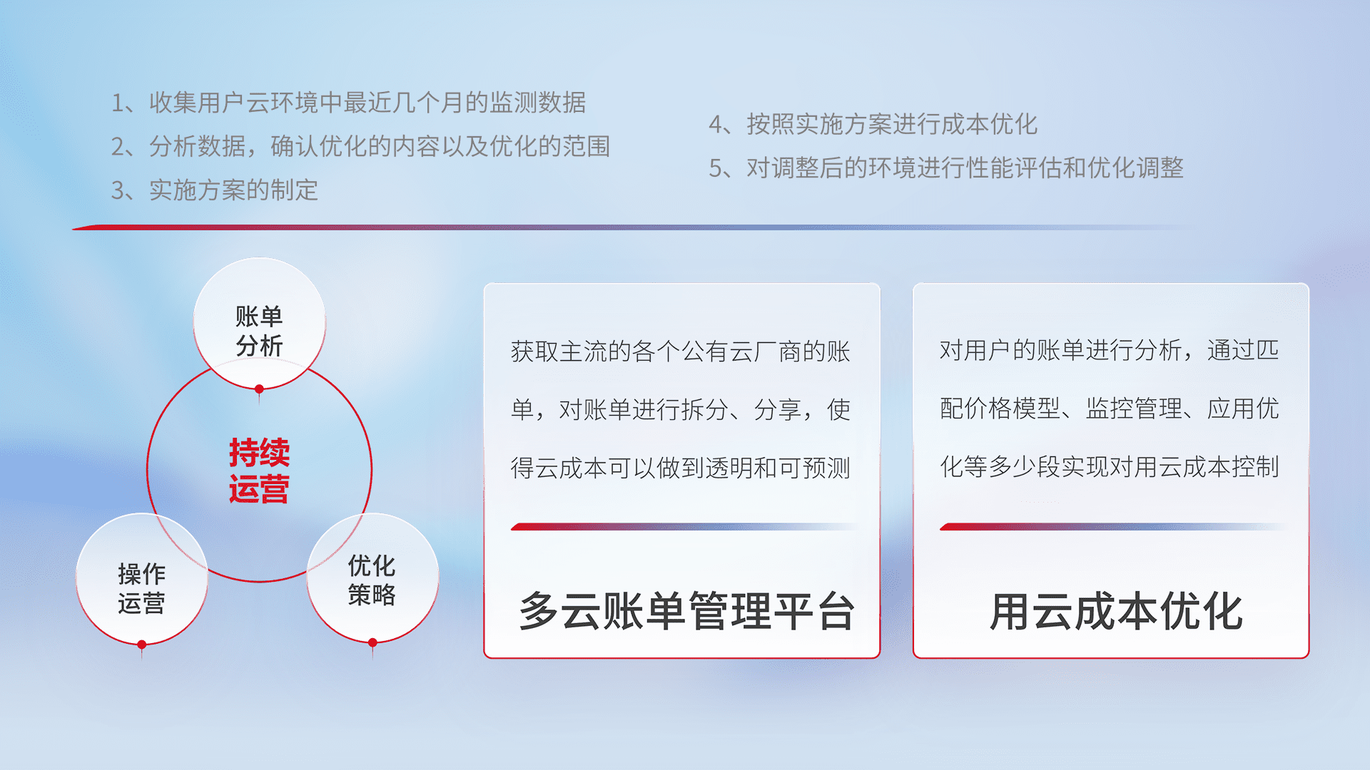 通过多云纳管,,,,以统一的资源数据模型把客户的云资源进行抽象和封装,,,,进而实现对多云资源的统一操作,,,,保障云资源管理的可靠性、、、稳定性与可用性。。。量身定制化运维内容,,,,配置、、、开发运维、、、、补丁管理、、、、备份、、监控、、、认证和访问管理、、、审计和日常巡检等,,,保障在用云过程中的可靠度,,,稳定度以及高可用率。。。。