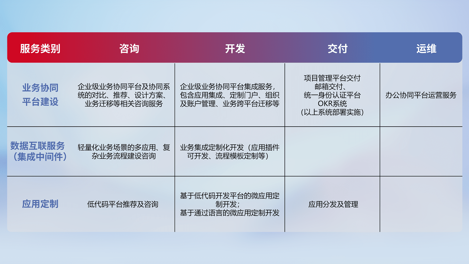针对钉钉、、、企微、、IDaas等平台级产品提供产品的规划、、方案、、、、交付、、、定制化开发等服务,,实现如统一协同办公、、、智能客户服务、、、、混合会议管理、、、智能数据查询、、等业务场景,,,,实现数字化转型。。。
